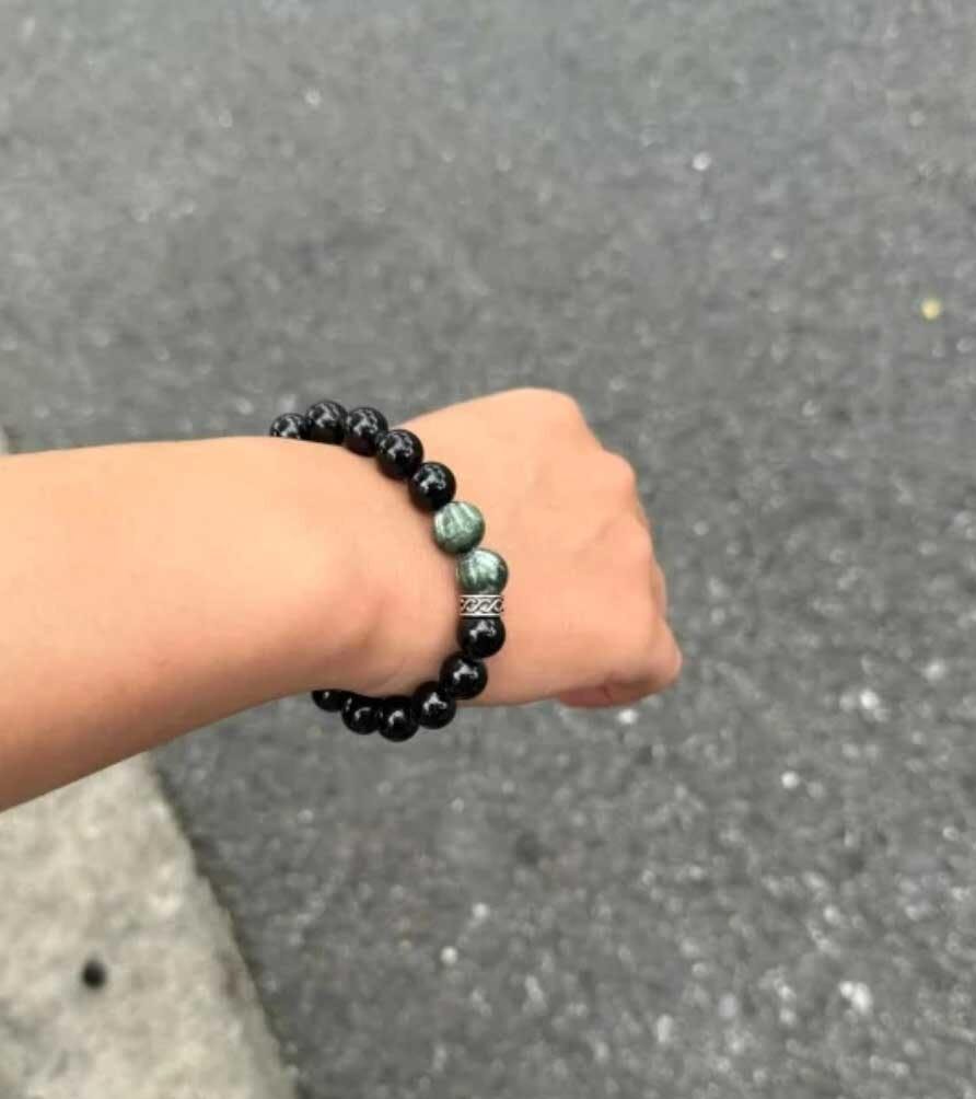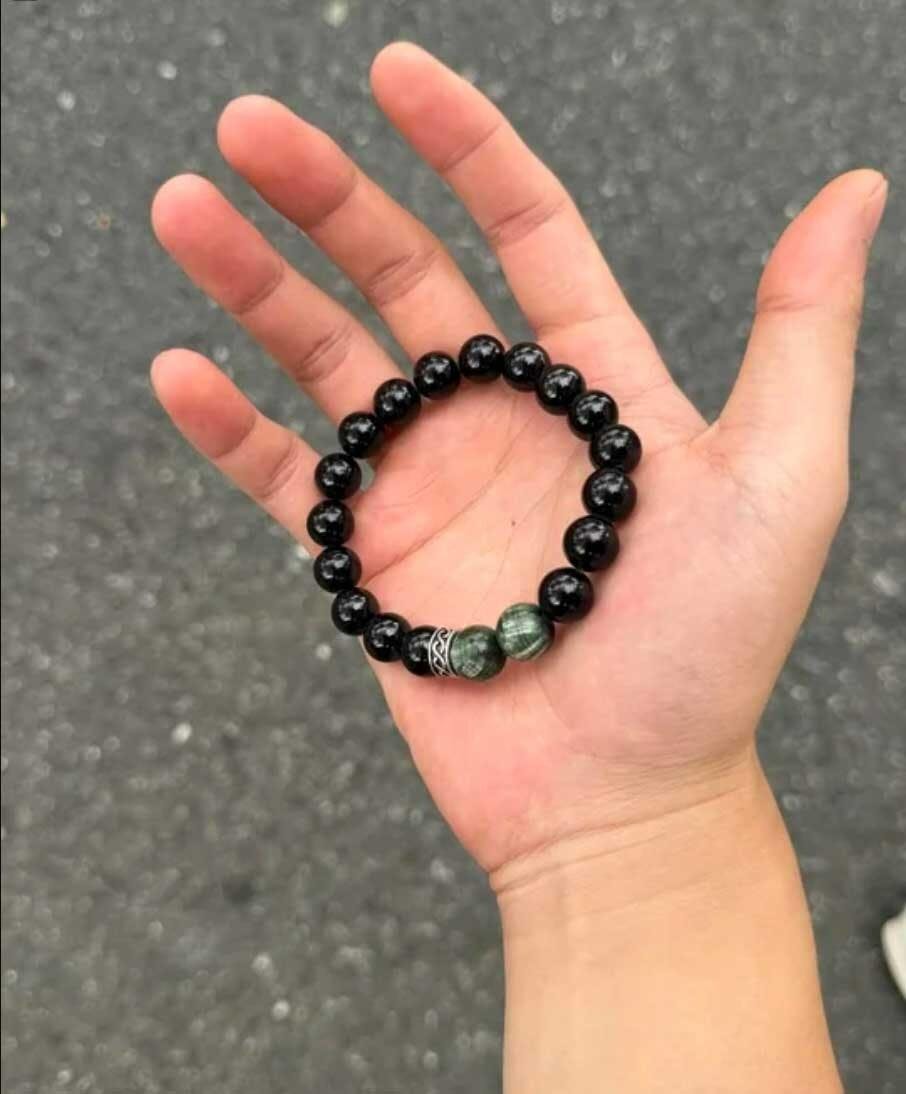This bracelet combines two powerful crystals—Black Tourmaline and Green Dragon Jade—to create a perfect balance of grounding protection and revitalizing energy: